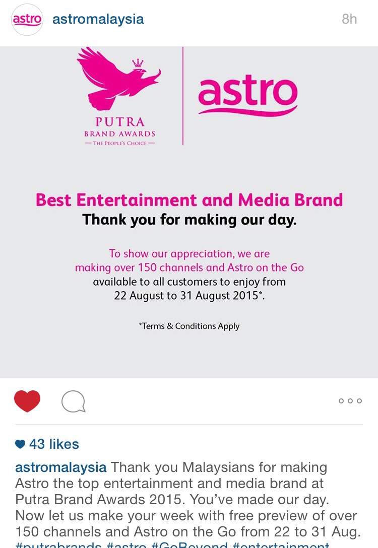 Sempena pencapaian stesen satelit berbayar, Astro meraih anugerah Jenama Media dan Hiburan Terbaik pada majlis Putra Brand Awards 2015 baru-baru ini, stesen ini memberi penghargaan pada pelanggan mereka dengan tontonan 150 saluran percuma!