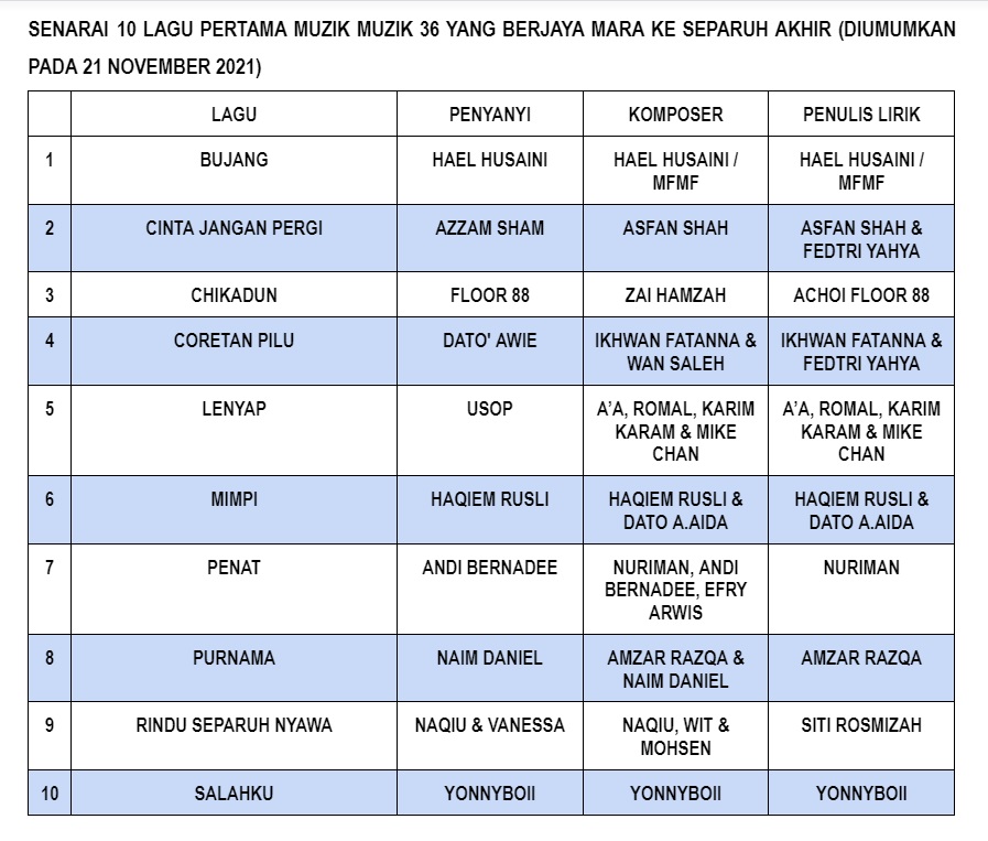 Teka teki penggiat muzik dan juga peminat untuk mengetahui 10 lagu terakhir tersenarai ke Separuh Akhir Muzik Muzik 36 akhirnya terjawab.