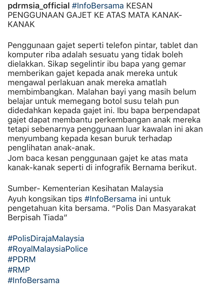 Menerusi Intagram @pdrmsia_official berkongsi informasi penting daripada Kementerian Kesihatan Malaysia (KKM) mengenai kesan penggunaan gajet ke atas mata kanak-kanak.