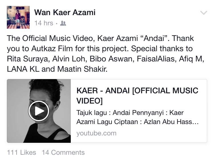 Kaer memaklumkan muzik video lagunya itu menerusi Facebooknya.