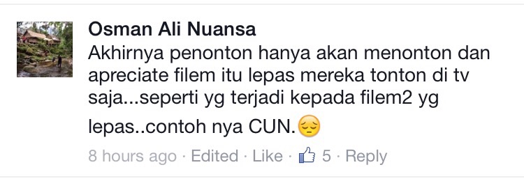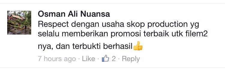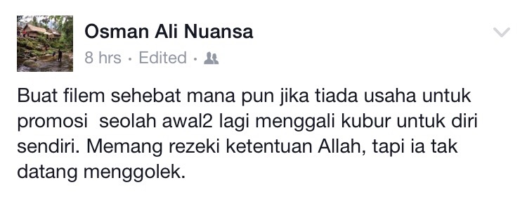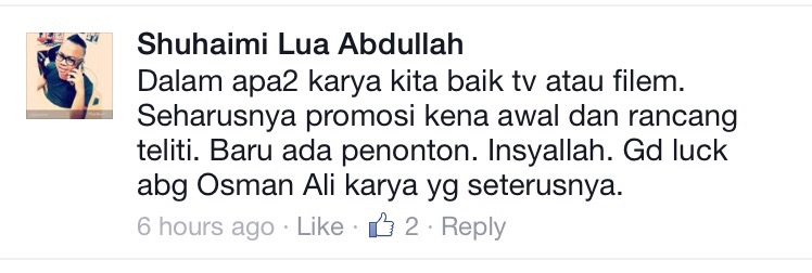 Pandangan sama diluahkan pengarah terkenal, Osman Ali menerusi Facebook menyatakan jika filem itu dihasilkan dengan hebat sekalipun tanpa usaha promosi diibaratkan menggali kubur sendiri.