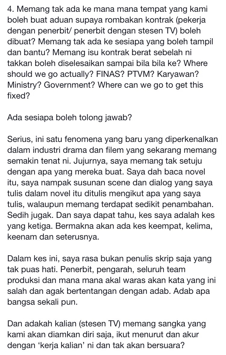 Luahan nasib penulis skrip sebegini dikongsi salah seorang penulis skrip, Eenaz Mokhtar di Facebook – Persatuan Penulis Lakon Layar Kuala Lumpur dan Selangor (PENULIS) yang mahu jalan penyelesaian terbaik diambil sama ada berhenti adaptasi drama ke novel atau bawa berbincang dengan penulis skrip sendiri.