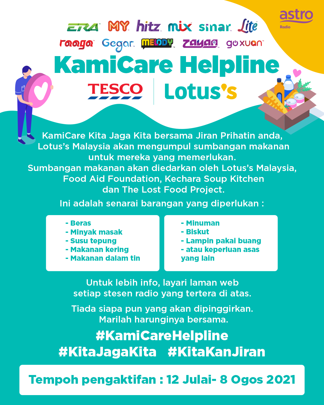 Astro Radio dengan kerjasama Lotus’s Malaysia memperluas KamiCare Helpline untuk menyediakan keperluan harian seperti beras, minyak masak, susu tepung, makanan kering, makanan dalam tin, minuman, biskut dan lampin pakai buang kepada rakyat Malaysia yang memerlukan buat masa ini hingga 8 Ogos 2021.