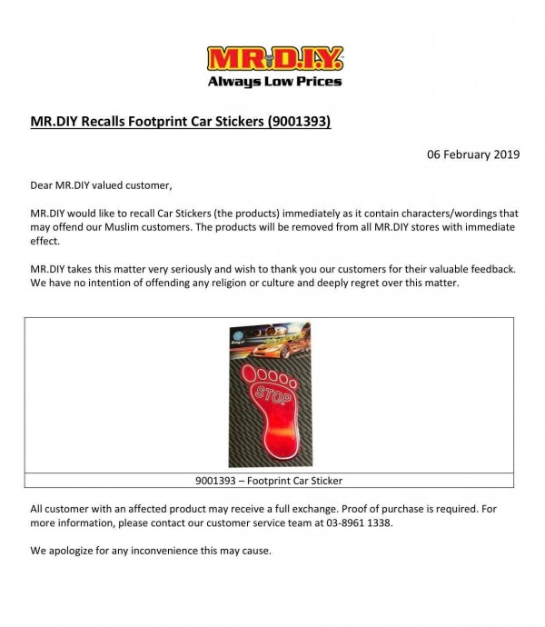 Dalam satu notis kepada pelanggan, pasaraya Mr D.I.Y memaklumkan pihaknya mengambil serius isu tersebut dan tidak berniat menyinggung mana-mana agama dan budaya.