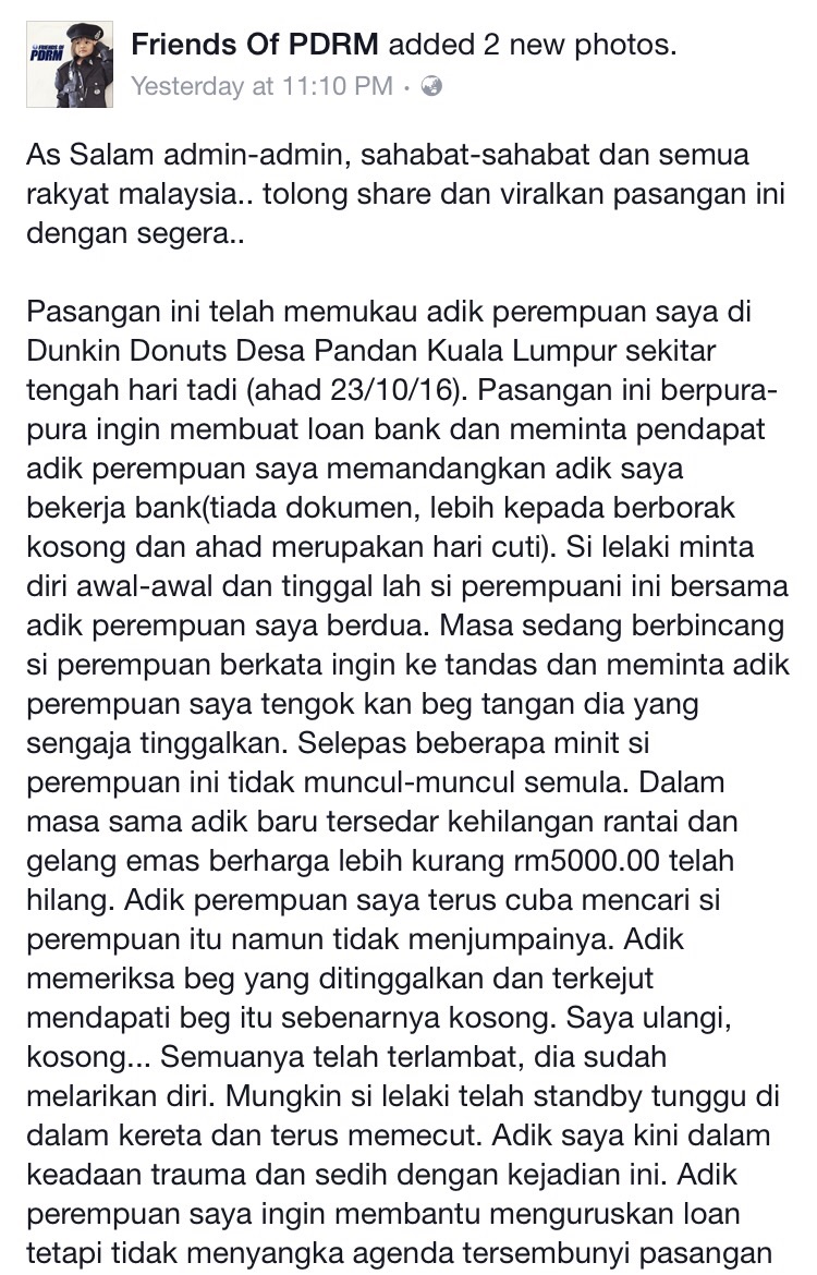Maklumat lanjut mengenai kejadian itu dikongsi abang mangsa di media sosial yang turut dimuat naik Friends of PDRM di Facebook, malam tadi.
