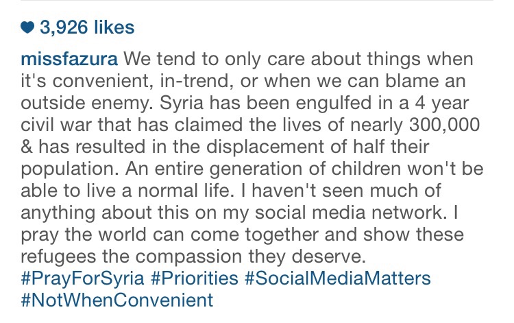 Apa yang ingin dikongsi pelakon itu agar kita sebagai masyarakat dunia berkongsi penderitaan yang dilalui rakyat berkenaan dan berdoa semua bersatu untuk menunjukkan tanda simpati terhadap pelarian ini.
