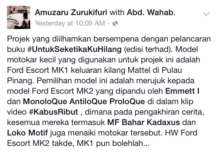 Seorang pengguna Facebook menyatakan kereta Ford Escort yang dijual itu sama seperti kereta yang pernah digunakan dalam band itu dalam klip video lagu Kabus Ribut dalam album Selamat Tinggal Dunia.