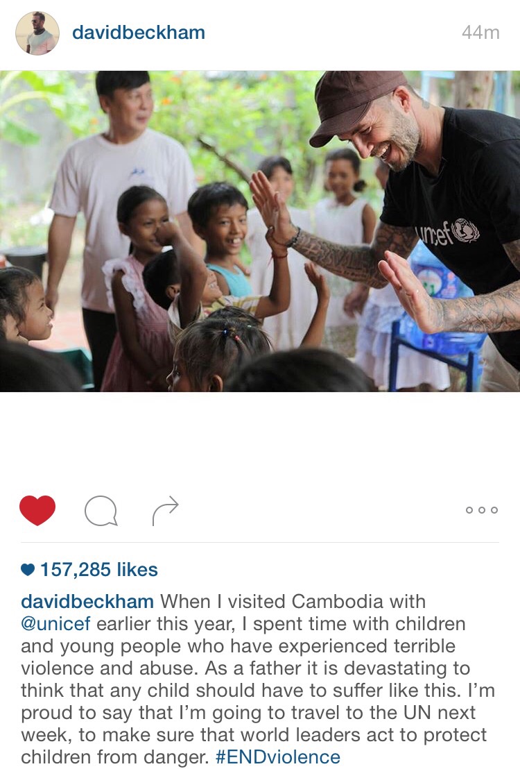 Menerusi status di Instagram hari ini, Beckham menyatakan dia berpeluang mengunjungi Kemboja mengikut program bersama Tabung Kanak-kanak Pertubuhan Bangsa-Bangsa Bersatu (UNICEF) pada awal tahun ini.
