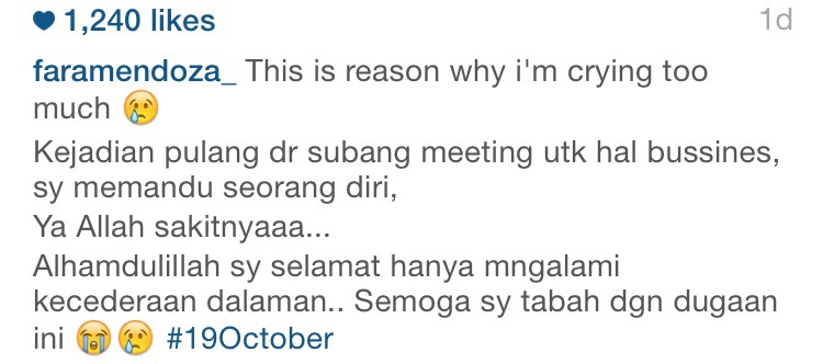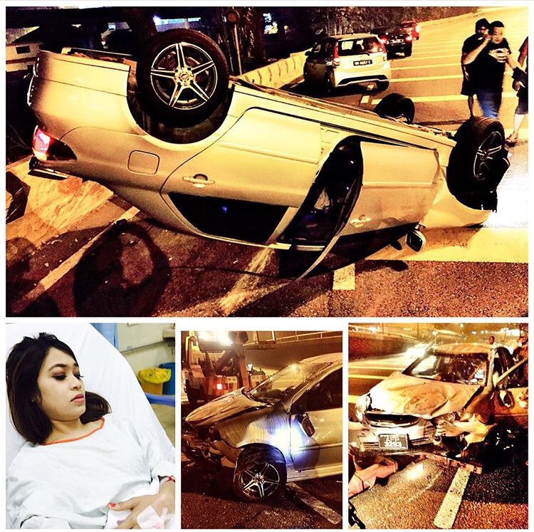 Menurut status di Instagramnya, kemalangan berlaku ketika dia dalam perjalanan pulang seorang diri dari Subang, Selangor selepas hadir satu mesyuarat.