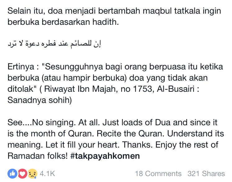 Moga seluruh umat Islam mendapat keberkatan Ramadan dan menjalani puasa dengan hati yang tenang dan memperbanyakkan amalan pada Nya.