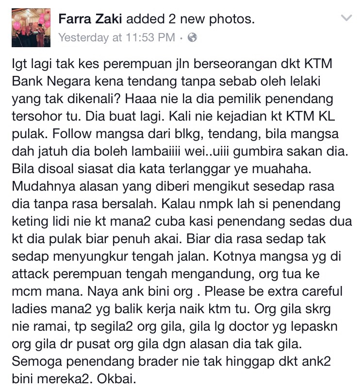 Jika sebelum ini pengguna komuter KTM berdekatan pusat membeli belah, Sogo khususnya wanita berdepan risiko menjadi mangsa ditendang dari belakang individu yang dipercayai tidak siuman, kejadian sama berlaku pada pengguna di stesen KTM Kuala Lumpur.