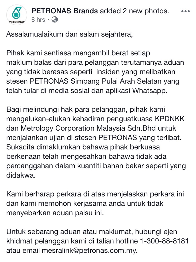Menurut kenyataan mereka di media sosial, Petronas bertindak mendapatkan kerjasama daripada Kementerian Perdagangan Dalam Negeri Koperasi dan Kepenggunaan (KPDNKK) menyiasat lebih lanjut dakwaan negatif yang dilemparkan ke atas jenama tersebut.