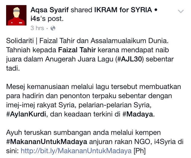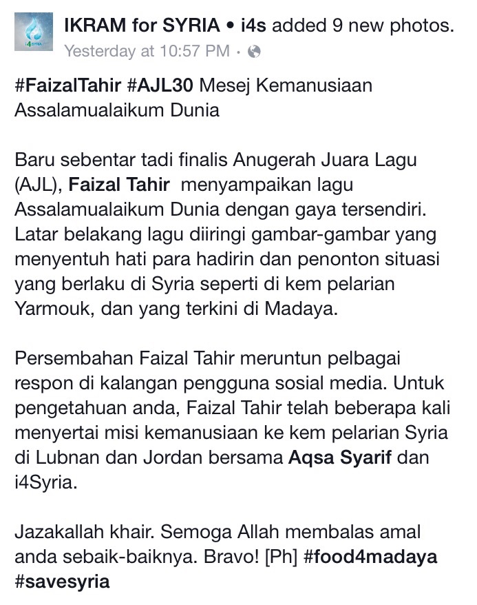 Kejayaan Faizal itu dikongsi pertubuhan bukan kerajaan (NGO), Aqsa Syarif dan Ikram for Syria menerusi Facebook yang melihat perjuangan misi kemanusiaan dalam lagu itu cukup menyentuh hati ramai.