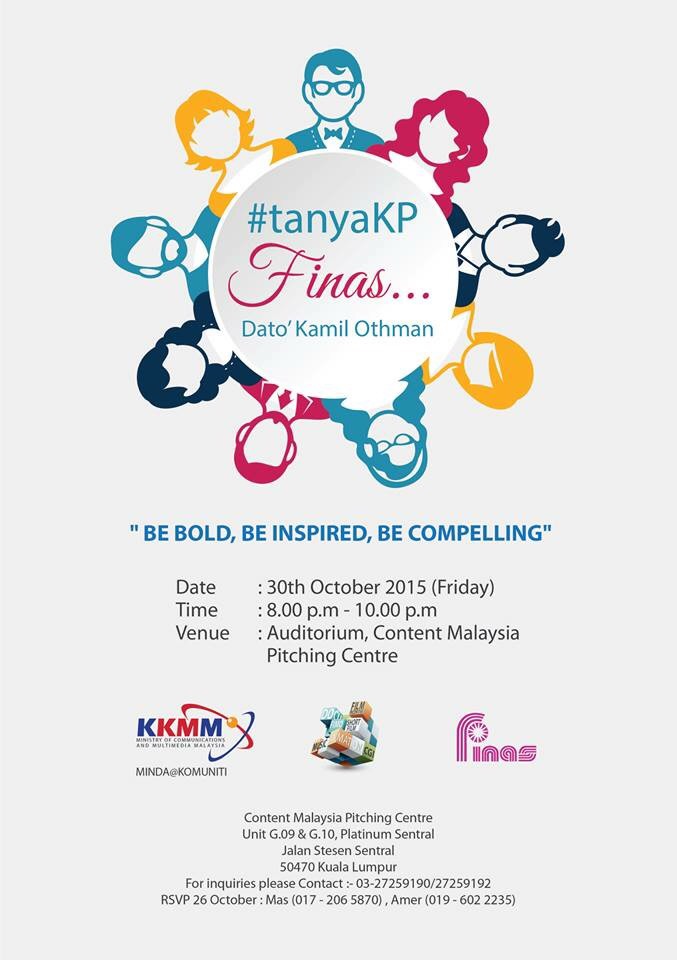 Jadi, sebagai merealisasikan impian itu, FINAS menganjurkan program #tanyaKP FINAS… Dato’ Kamil Othman di Auditorium, Content Malaysia Pitching Centre, Platinum Sentral, Kuala Lumpur jam 8 malam ini (30 Oktober).