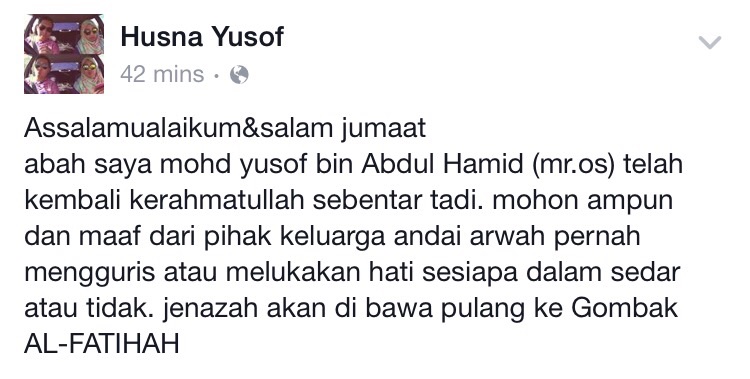 Perkara tersebut disahkan anaknya menerusi Facebook.