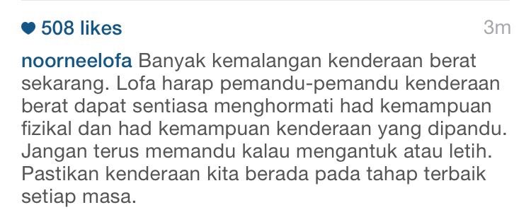 Katanya di Instagram, dia berharap pemandu kenderaan berat dapat sentiasa menghormati had kemampuan fizikal dan kenderaan yang dipandu.