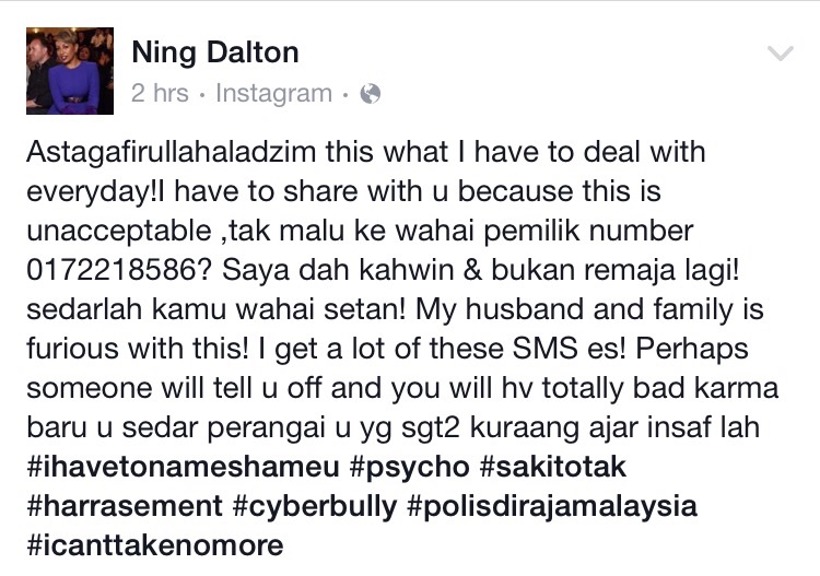 Menerusi status di Facebooknya hari ini, Ning mendedahkan nombor telefon misteri yang sering menganggunya dengan SMS lucah.