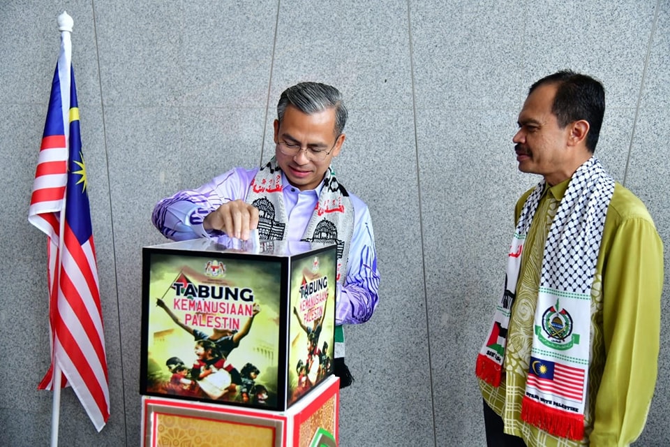 Fahmi (kiri) turut melancarkan Tabung Kemanusiaan Palestin peringkat KKD sambil disaksikan Ketua Setiausahanya, Datuk Mohamad Fauzi Md Isa. (Foto: Fahmi Fadzil – Facebook)