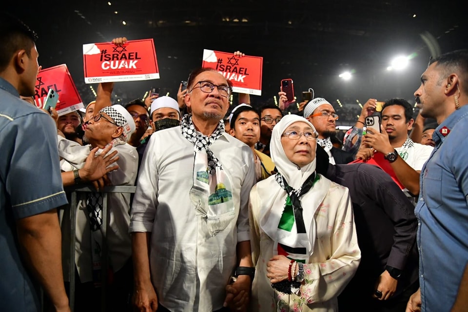 Perdana Menteri, Datuk Seri Anwar Ibrahim bersama isteri, Datuk Seri Wan Azizah Wan Ismail bersama-sama menyatakan solidariti kepada Palestin menerusi acara Himpunan Malaysia Bersama Palestin di Kuala Lumpur, baru-baru ini. (Foto: Fahmi Fadzil – Facebook)