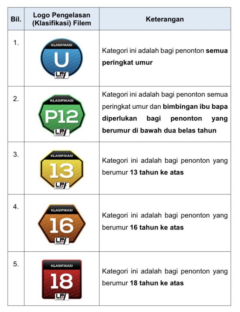 LPF pada 1 Februari lalu memperkenalkan lima klasifikasi filem Malaysia. Jika sebelum ini filem tempatan hanya mempunyai 3 klasifikasi iaitu U merujuk tonton umum tanpa had umur, P13 bagi penonton bawah usia 13 tahun perlu pengawasan dan bimbingan ibu bapa atau penjaga manakala kategori 18 ialah untuk penonton berusia 18 tahun ke atas.