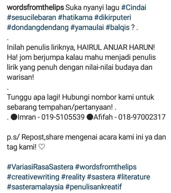 Moga perkongsian Hairul Anuar Harun ini dapat mencetuskan lebih ramai penulis lirik yang kreatif dan puitis.