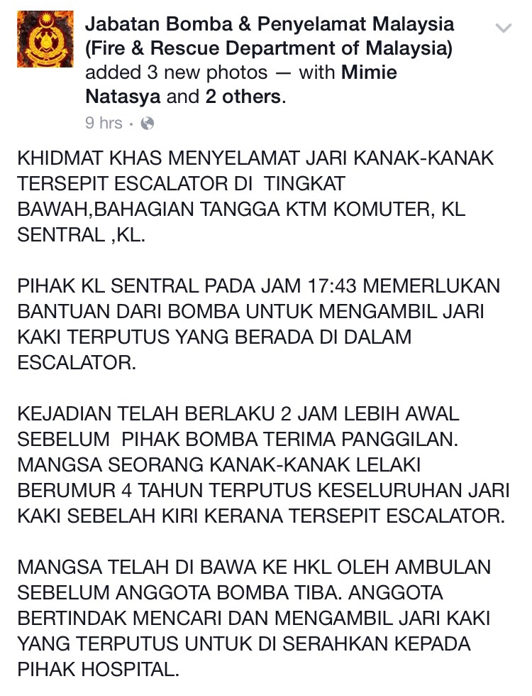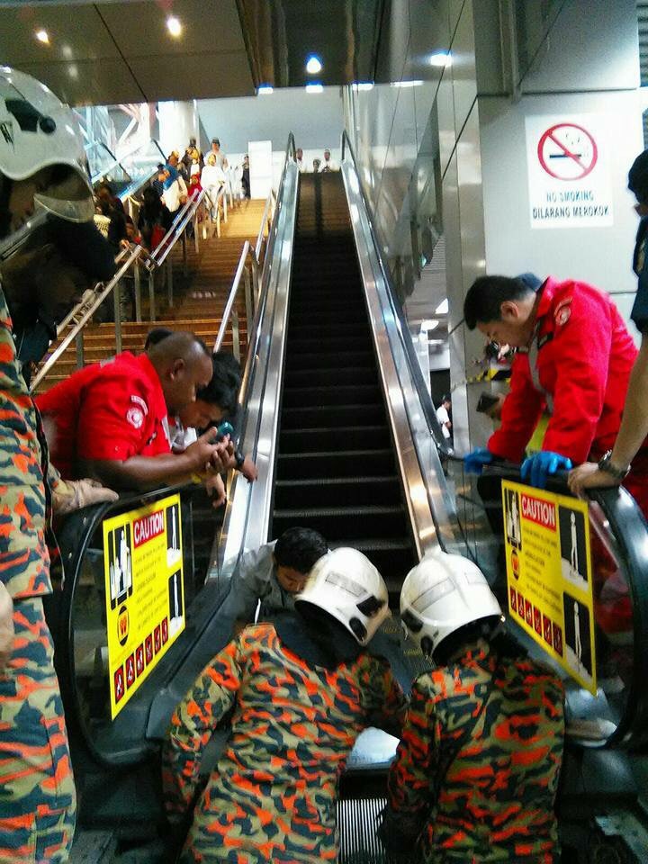 Menerusi maklumat dan gambar Jabatan Bomba dan Penyelamat di Facebook, orang ramai juga berkongsi pandangan terhadap kejadian berkenaan dan panduan keselamatan sebagai pengguna eskalator.