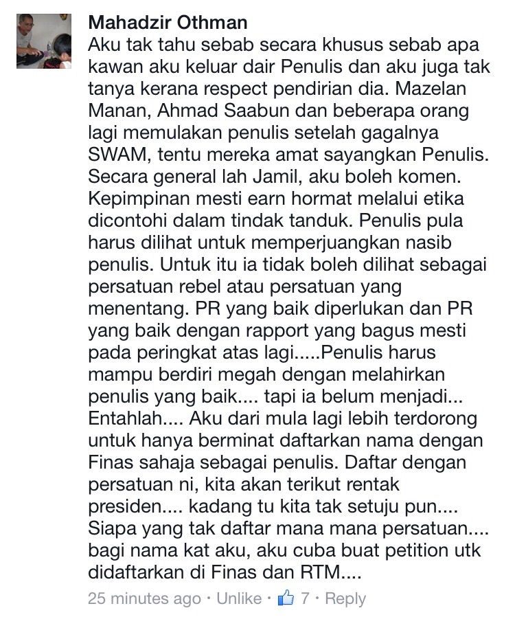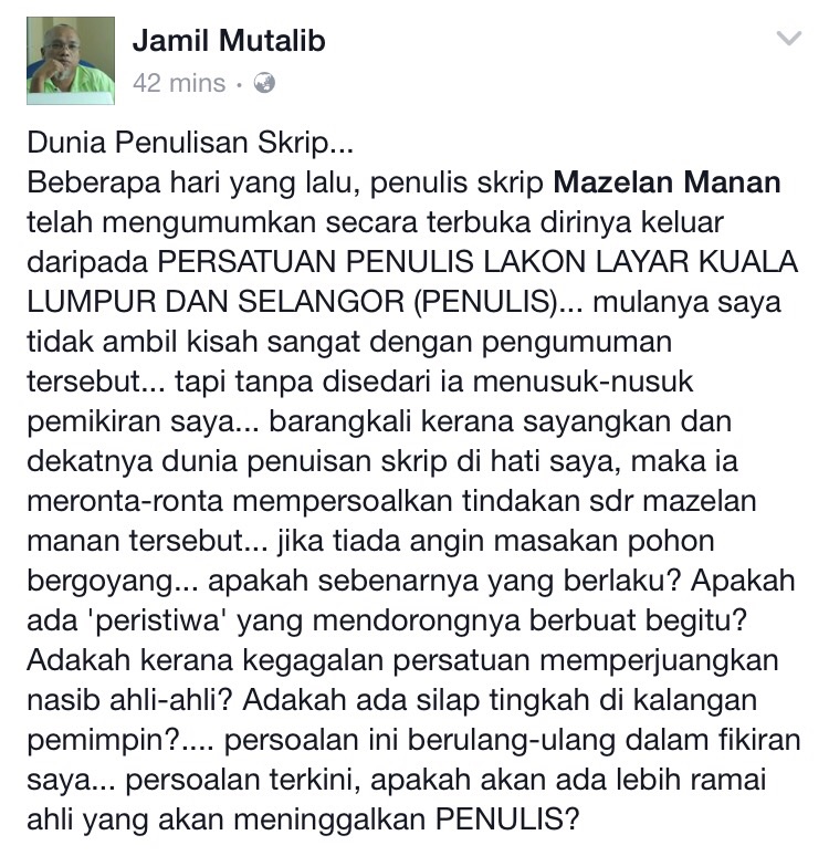 Mungkin komen ahli itu menyatakan berpersatuan untuk mencipta hukum sendiri memberi jawapan sebenar apa yang berlaku pada PENULIS. Jika benar apa yang dikatakan, apakah PENULIS masih kekal relevan beroperasi atau mungkin cadangan cukup sekadar mendaftar nama penulis skrip bersama Perbadanan Kemajuan Filem Nasional (FINAS) tanpa perlunya persatuan.