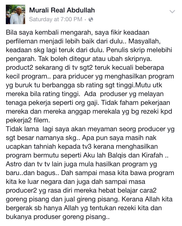 Satu perkongsian daripada pengarah drama terkenal, Murali Abdullah terhadap situasi filem dan drama tempatan ketika ini yang disifatkannya semakin teruk.