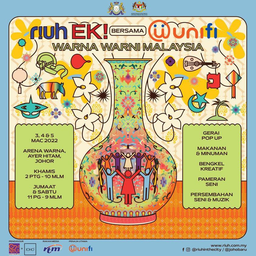 Bertemakan ‘Warna-warni Malaysia’, “RIUH EK! bersama unifi” adalah terbuka kepada semua pengunjung terutama yang berada di sekitar Johor khususnya di Ayer Hitam. Para pengunjung akan merasai pelbagai tarikan termasuk barangan kreatif tempatan, persembahan seni dan muzik, bengkel kreatif, pameran seni, gerai ‘pop-up’, aneka makanan dan minuman serta banyak lagi untuk diteroka pengunjung.