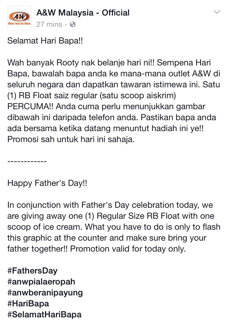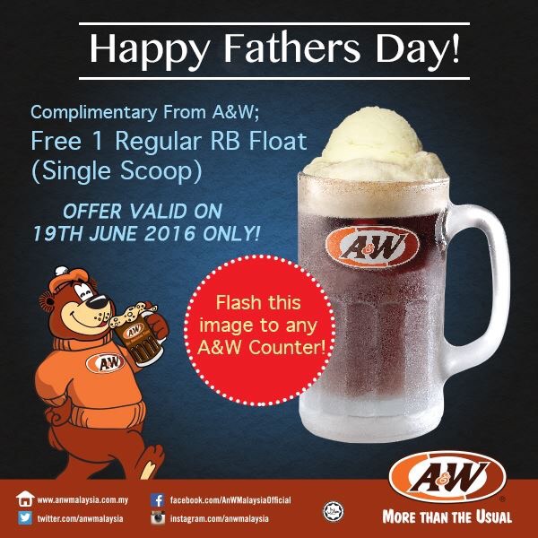 Promosi di mana-mana cawangan restoran A&W dan hanya sah untuk hari ini sahaja. Jom peminat ‘root’ bir kita serbu restoran A&W hari ini sambil menghiburkan bapa kita!
