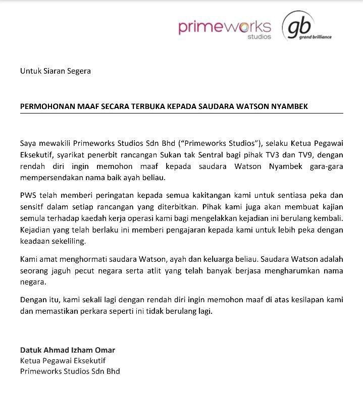 Ketua Pegawai Eksekutif, Datuk Ahmad Izham Omar berkata, syarikat penerbit rancangan Sukan tak Sentral bagi pihak TV3 dan TV9 dengan rendah diri memohon maaf kepada Watson Nyambek gara-gara mempersendakan nama baik ayah beliau.