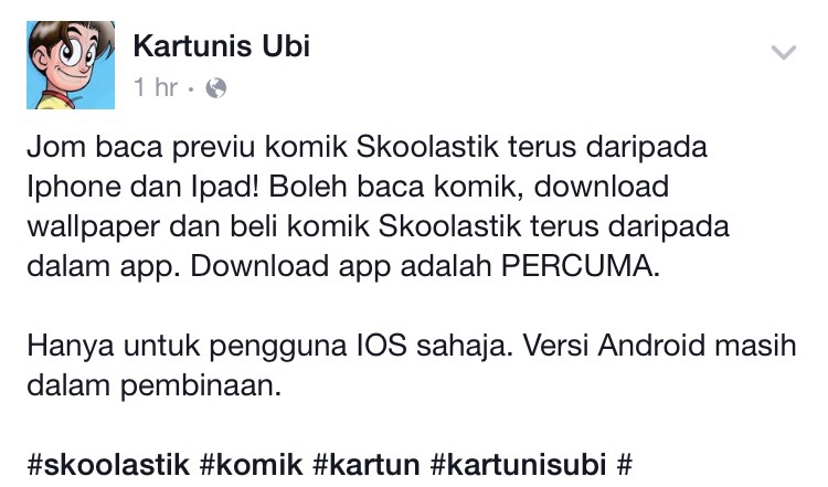 Menurut statusnya di Facebook, komik baru dikenali Skoolastik ini boleh dimuat turun secara percuma.