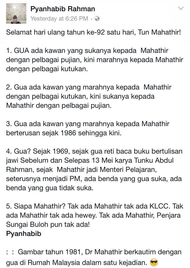 Paling menarik perhatian khalayak, status daripada penyair dan pelakon terkenal, Pyanhabib Rahman mengenai tokoh negarawan terkenal itu yang turut menghiburkan peminat selebriti itu.