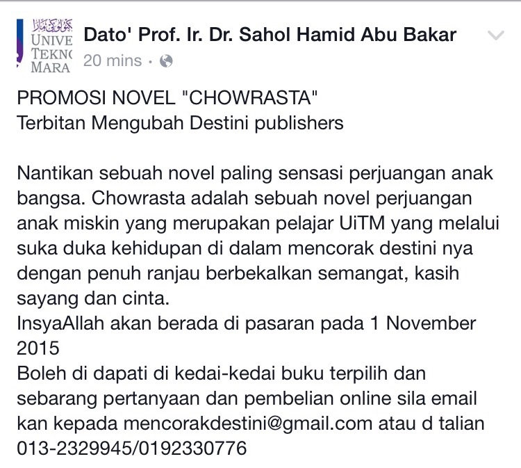 Perkara itu juga dikongsi Naib Canselor UiTM, Prof Tan Sri Ir Dr Sahol Hamid Abu Bakar di Facebooknya.