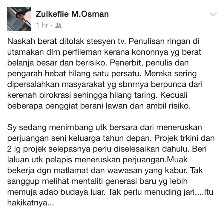 Pengarah terkenal, Zulkeflie M Osman juga meluahkan pandangannya terhadap stesen TV yang menolak karya difikirkan ‘berat’ kerana bajet besar dan berisiko.